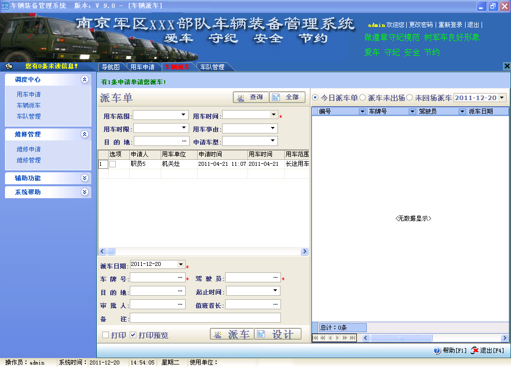 4、对营区车辆进行分类管理分为私家车、领导专用车、车辆正常待命、车辆派遣出车、车辆故障维修、车辆报废等状态。调度人员根据车辆显示状态合理科学调度车辆。